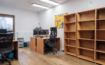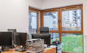 Oferowane pomieszczenia to jedno lub dwa biura na parterze — mogą być wynajmowane jako wspólna, duża powierzchnia albo jako niezależne lokale, w zależności od potrzeb najemcy. Przestrzeń jest w pełni dostosowana do działalności biurowej: nowoczesne okablowanie sieciowe, regały i półki na dokumenty, gotowe stanowiska z biurkami (wyposażenie biur może zostać usunięte), magazynek i serwerownia (z dodatkową klimatyzacją), magazynek zapewniają gotowość do pracy od samego początku.