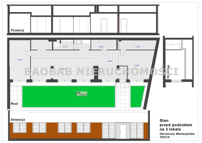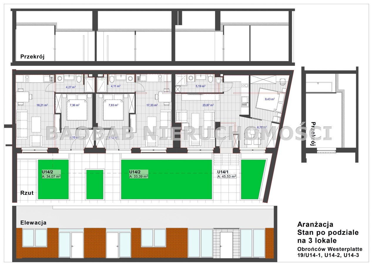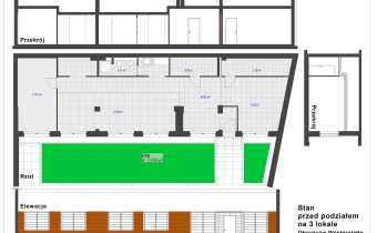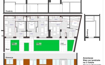 Można również wydzielić z niego 3 niezależne apartamenty – 34,0m2, 33,4m2, 45,5m2 (właściciel