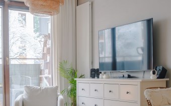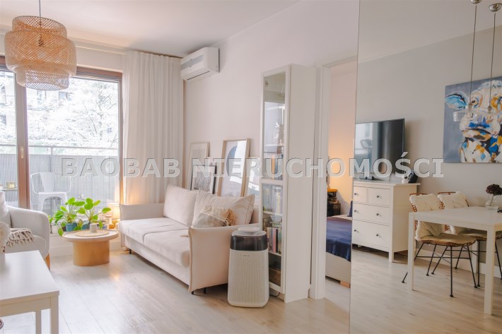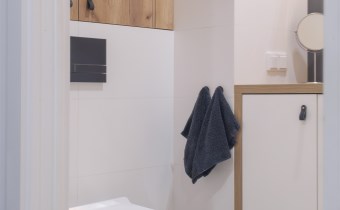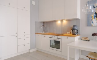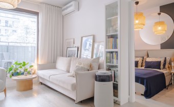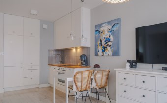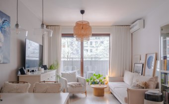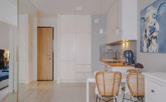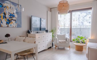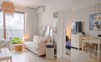 Mieszkanie jest bardzo ciepłe, a jednocześnie wyposażone w klimatyzację, co zapewnia komfort przez cały rok. Solidne, drewniane okna dodatkowo podnoszą jakość wykończenia i wpływają na przyjemny klimat wnętrza. Całość urządzona jest w jasnej, spokojnej kolorystyce, która sprawia, że mieszkanie jest przytulne i od razu daje poczucie „bycia u siebie”.