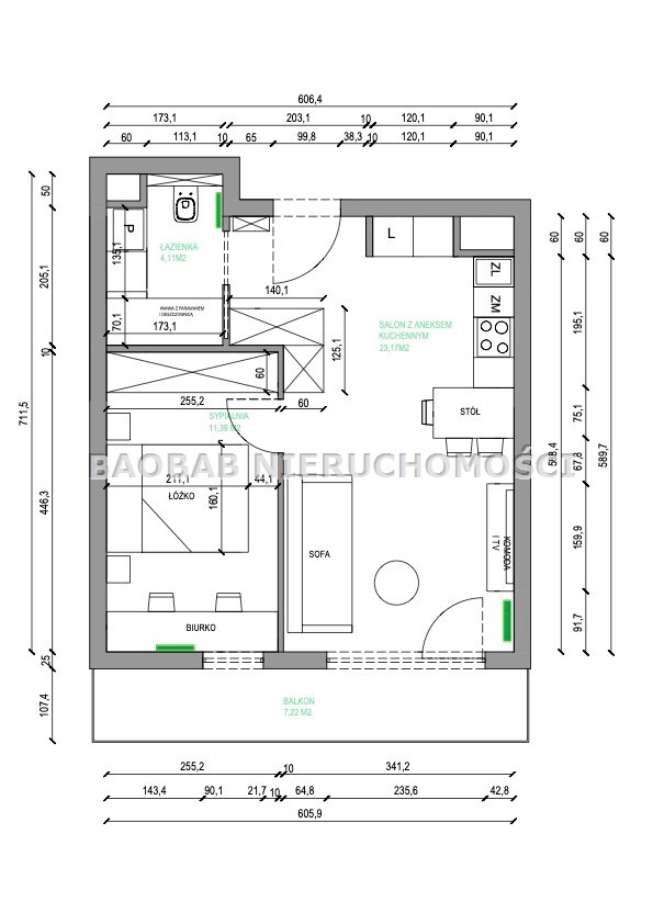 Z salonu prowadzi wyjście na duży balkon, który stanowi naturalne przedłużenie strefy dziennej i daje możliwość relaksu na świeżym powietrzu w cieplejsze dni. To idealne miejsce na poranną kawę lub spokojny wieczór po pracy.