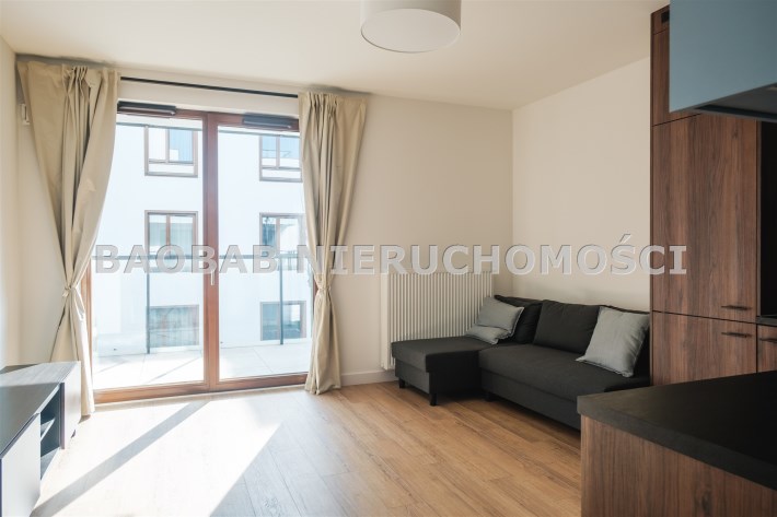 1-pokojowe zlokalizowane jest na pierwszym piętrze z oknami wychodzącymi na południowy - zachód. Mieszkanie z 2025 roku, wykończone w nowoczesnym stylu. W przestronnym, dobrze doświetlonym (dzięki dużym oknom) salonie z aneksem kuchennym o łącznej powierzchni 19,25m2 znajduje się 2-osobowa, rozkładana sofa oraz szafka pod telewizor. Kuchnię wyposażono w lodówkę, płytę indukcyjną, piekarnik oraz zmywarkę. W łazience (4,08m2) znajduje się kabina prysznicowa oraz pralka (Beko). W przedpokoju (3,79m2) wstawiono dużą szafę z miejscami na ubrania wyjściowe (kurtki, płaszcze buty), jak i zwykłe - z wieszakami na koszule, półkami i szufladami na bieliznę. Całość dopełnia duży balkon (5,34m2).