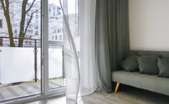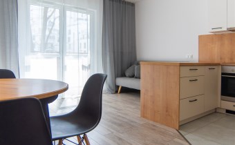 przestronnego salonu z aneksem kuchennym, w pełni wyposażonym w sprzęt AGD, z wyjściem na balkon,