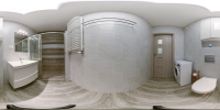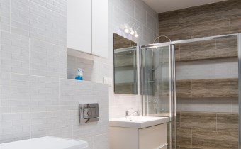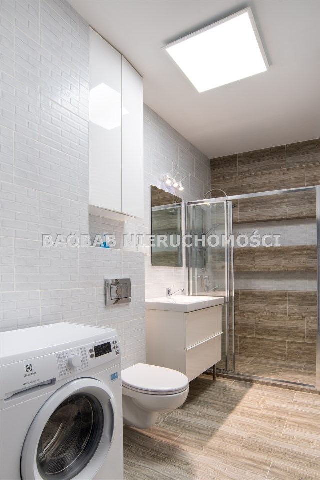 łazienki z kabiną prysznicową i pralką,