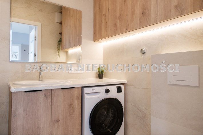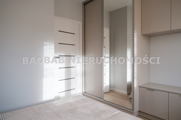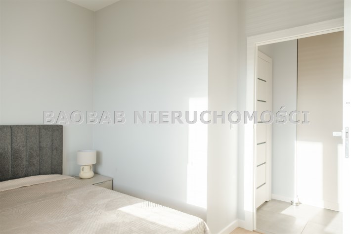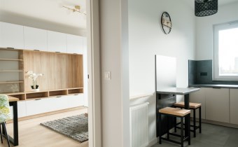 Mieszkanie jest w pełni umeblowane i gotowe do wprowadzenia się. W kuchni znajduje się lodówka, piekarnik, płyta indukcyjna, zmywarka, piekarnik, a w pokojach – wygodne meble, telewizor, łóżko oraz pojemne szafy. Całość urządzona została w nowoczesnym stylu z dbałością o komfort przyszłych najemców.