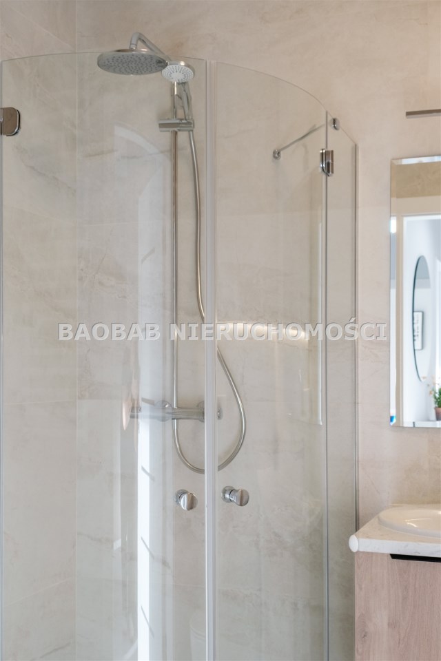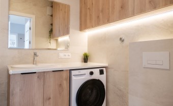 Wyposażenie łazienki kabina prysznicowa, lustro, natrysk, pralka, prysznic, umywalka, WC